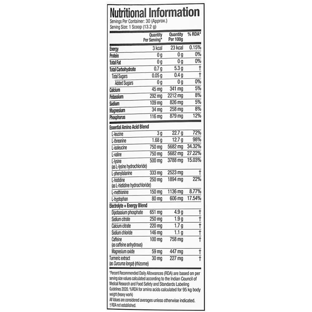 Essential Amino Acid Blend (57%) (L-Leucine, L-Threonine, L-Isoleucine, L-Valine, L-Lysine Hydrochloride, L-Phenylalanine, L-Histidine Hydrochloride, L-Methionine, L-Tryptophan), Acidity Regulators (Citric Acid, DL-Malic Acid), Electrolyte + Energy Blend (11%) (Dipotassium Phosphate, Sodium Citrate, Calcium Citrate, Sodium Chloride, Caffeine Anhydrous, Magnesium Oxide), Natural Identical Flavouring Substances (Sour Apple), Silicon Dioxide (Anti-Caking Agent), Sweeteners (Steviol Glycosides, Sucralose), Turmeric Extract (0.2%), Brilliant Blue FCF (Color).